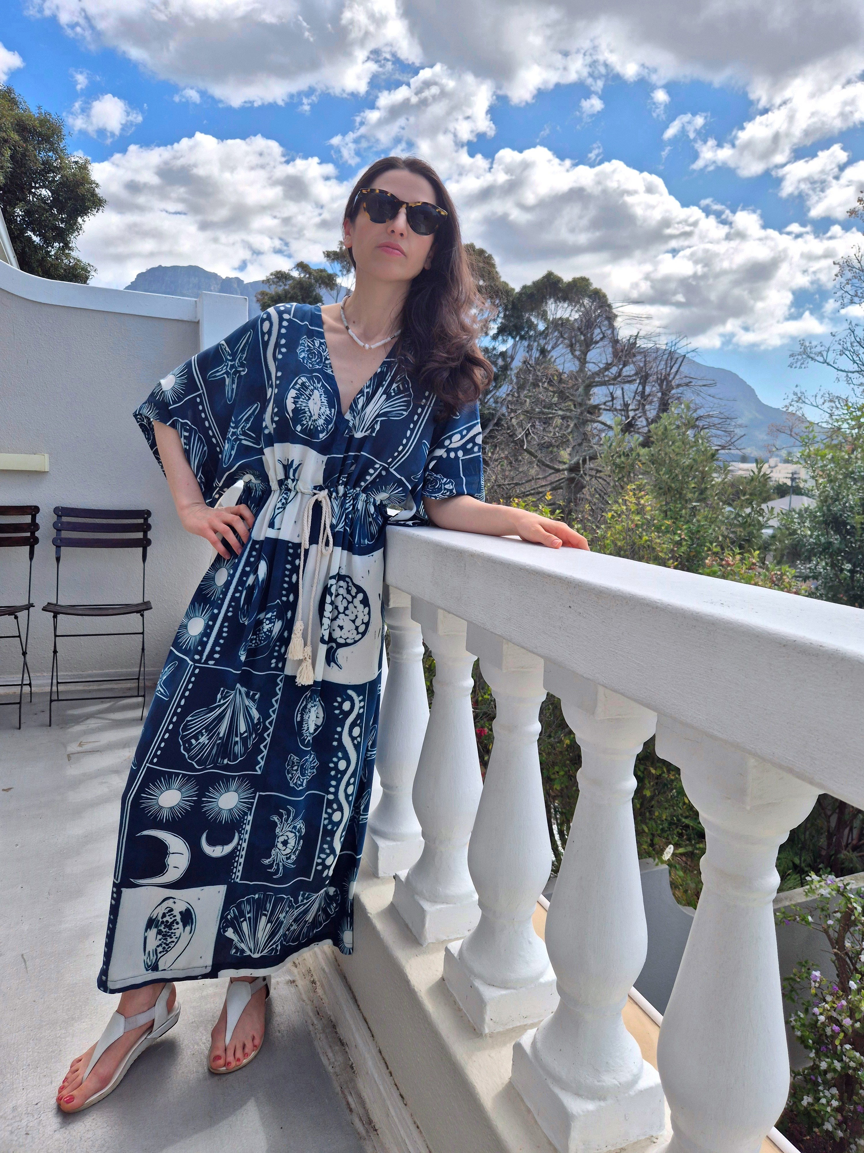 This beautiful blues and off white ocean themed maxi dress is of a high quality sustainably produced and sourced viscose, imported from Spain. The sleeves are just over the elbow in length and a Kimono sleeve in cut.The waist is a high princess line waist sinched in with a cord and tassle or left loose for more of a loose kaftan look. Sizes are generous and true to size. Model Kate is wearing a size small.
